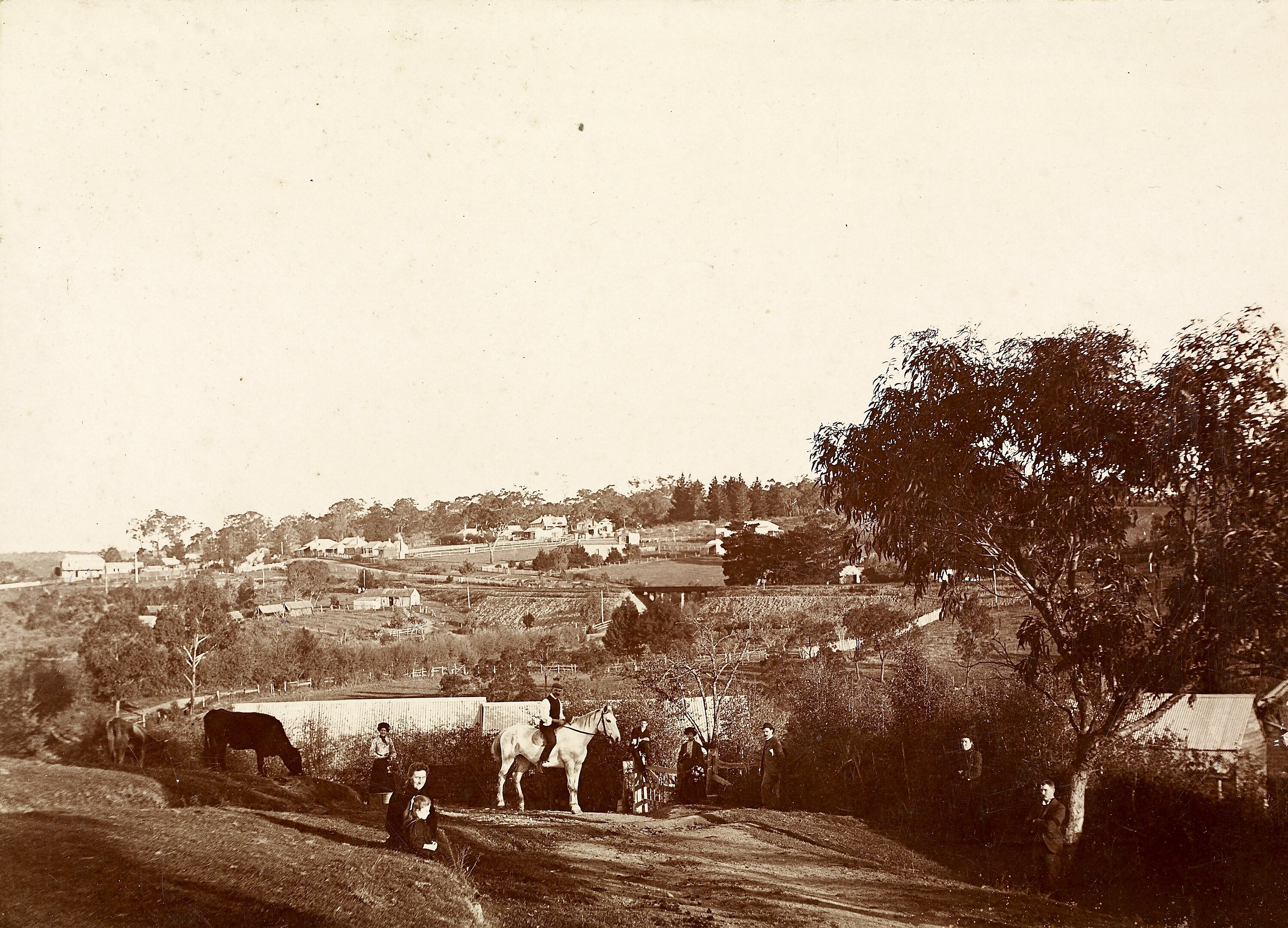 View looking south from the Partington family property 'Willis Vale' at Greensborough. The property was situated on a hill sloping down to the Plenty River. On a portion of the property was the orchard leased by Robert Whatmough for his nursery business. In the foreground are members of the Partington Family who lived in the main house. The orchard is directly behind them and follows the white fence around to the left. Prudence and Eva Partington in the foreground. This image was processed by the Richmond Studio, H.W Roissien.