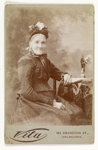 Studio portrait of Ellen Partington, nee Whatmough. As the sister of Robert Whatmough she is the link between the Partington and Whatmough Families. It was Ellen and her husband Charles who rented 'Willis Vale', Greensborough which was both the Partington home and the site of her brother Robert's Orchard, where he ran his successful nursery business. The image was taken at Vita Studio at 125 Swanston St, Melbourne.