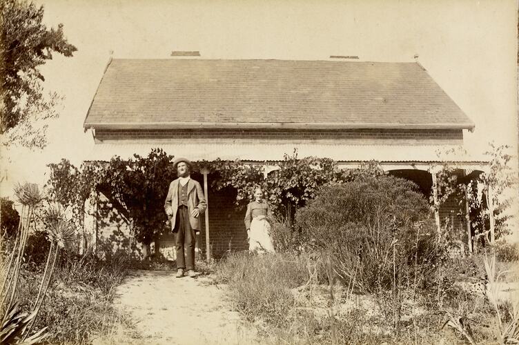 Man with beard, wearing a jacket and hat, standing at the end of a path with a woman wearing an apron standing beside and slightly to the rear of him. Behind them is a modest house built of brick with a slate roof, two chimneys and a corrugated iron-roofed verandah across the front. Behind them in front of the house are fruit trees while running down the hill towards the photographer is a somewhat neglected garden.