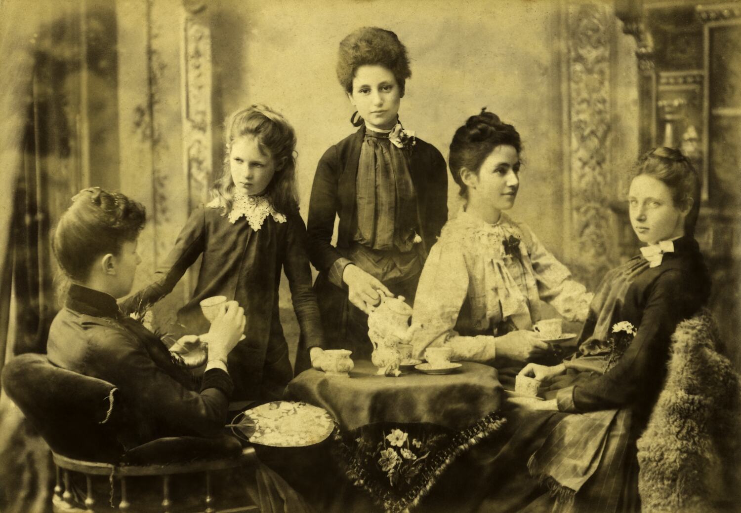 Sepia image of five women around a small table drinking tea. The central woman is standing.
