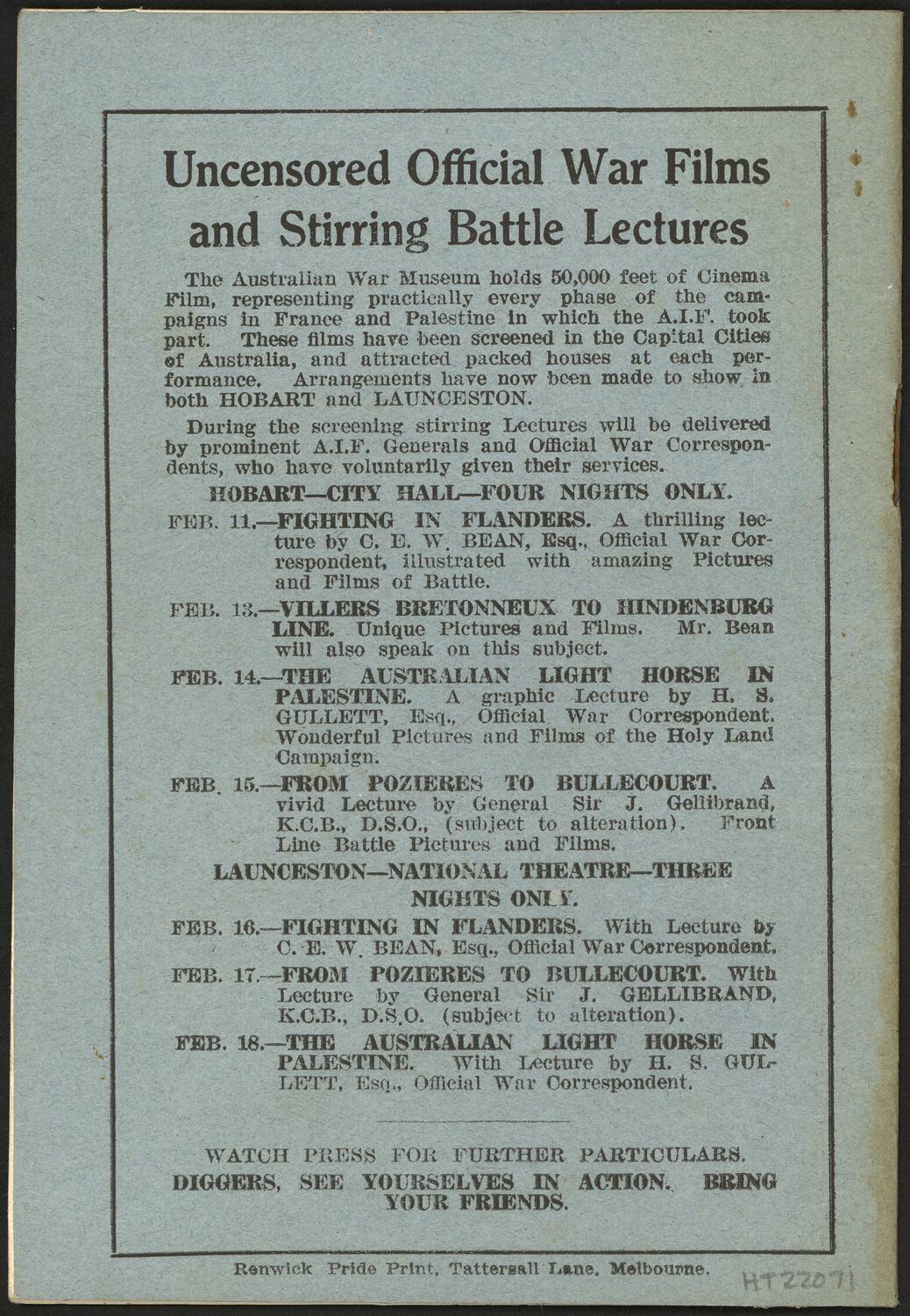 The catalogue lists the 247 photographs in the exhibition, with brief descriptions of the place and circumstances depicted, and their 'Official Photo No.' Visitors could access the Australian War Museum's 'entire' collection of 20,000 photographs, contained in 'records and albums', and order copies of them. It was suggested that the copies would make suitable gifts for returned soldiers.