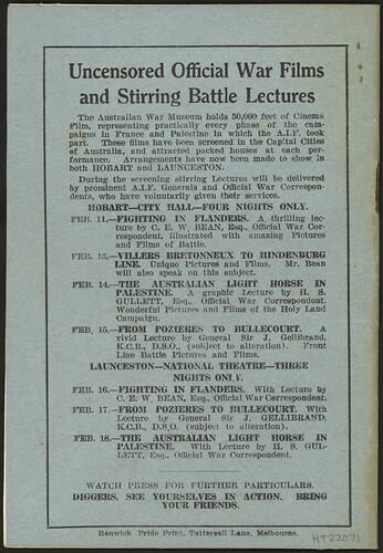 Booklet titled 'Descriptive Catalogue / Exhibition of Enlargements / Official War Photographs', produced to accompany an exhibition of 'Official War Photographs' arranged by the Australian War Museum, Exhibition Building, Melbourne, in 1921. Although the War Museum opened officially to the public on Anzac Day, 1922, several smaller exhibitions were held earlier, including this photographic exhibition which opened in August 1921.