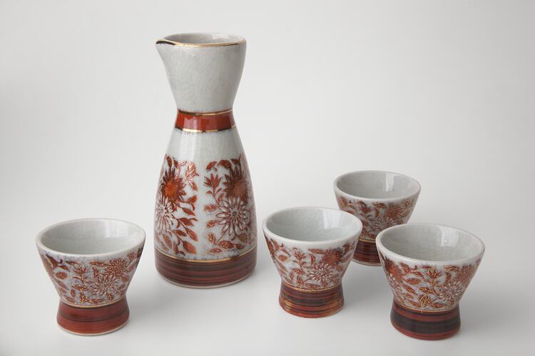 Japanese ceramic sake set brought to Australia by Machiko Mizuta when she migrated as a war bride from Japan in 1952. Machiko met Douglas Bryce, an Australian army engineer, during his posting to Kure in occupied Japan in the late 1940s. They married in Australia in 1953 and encountered both acceptance and prejudice before settling in a war service home in Clayton. Machiko remained in Australia with her children after Douglas' death.