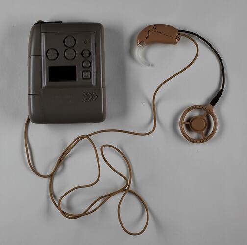Rectangular grey coloured plastic battery pack with ear piece and circular magnetic processor attached by a long cord
