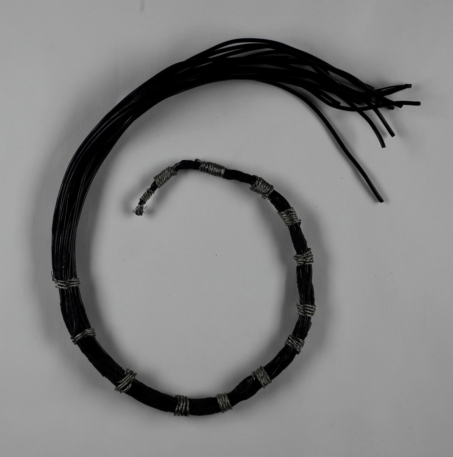 Fourteen wires covered in black plastic forming a bundle with one wire wrapping around the bundle at increments until there is one one wire left.