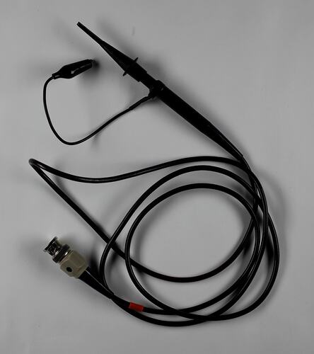 Long brown plastic tube with electrode tester and earth lead at one end and computer connector at the other.