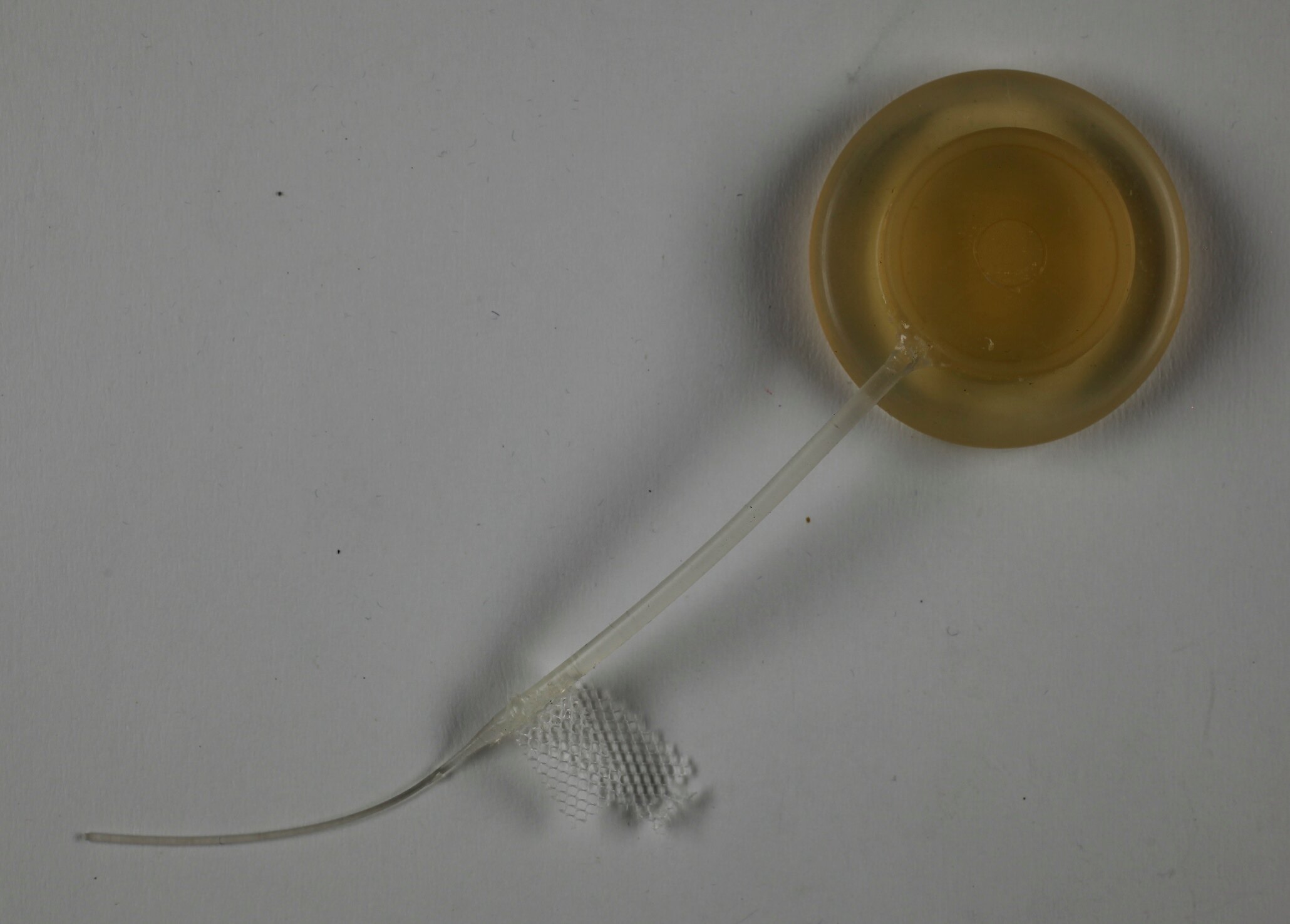Flat circular disk with smaller circular disk on top, which has a thin tubular tail-like aerial. There is a small piece of white surgical mesh attached to the tail-like tubular aerial.