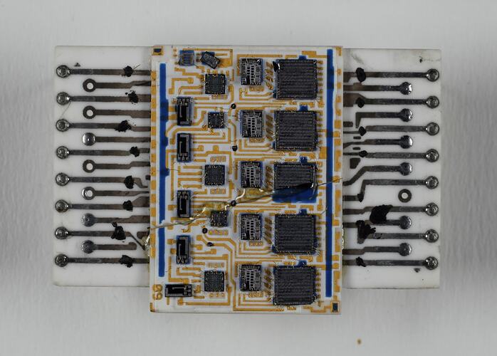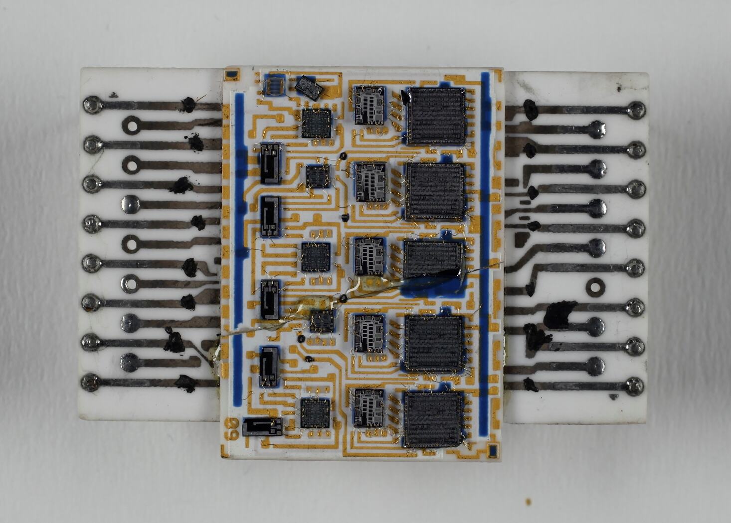 Electrode substrates for the prototype receiver-stimulator (gold box) for the bionic ear project, University of Melbourne, 1976-1977.