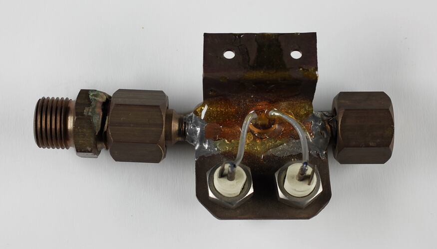 Tarnished gold coloured cylinder with two spiral connectors on each end. It has an 'L' shaped platform in the middle with two plugs connected to grey wires and is covered is a yellowish glue/resin.