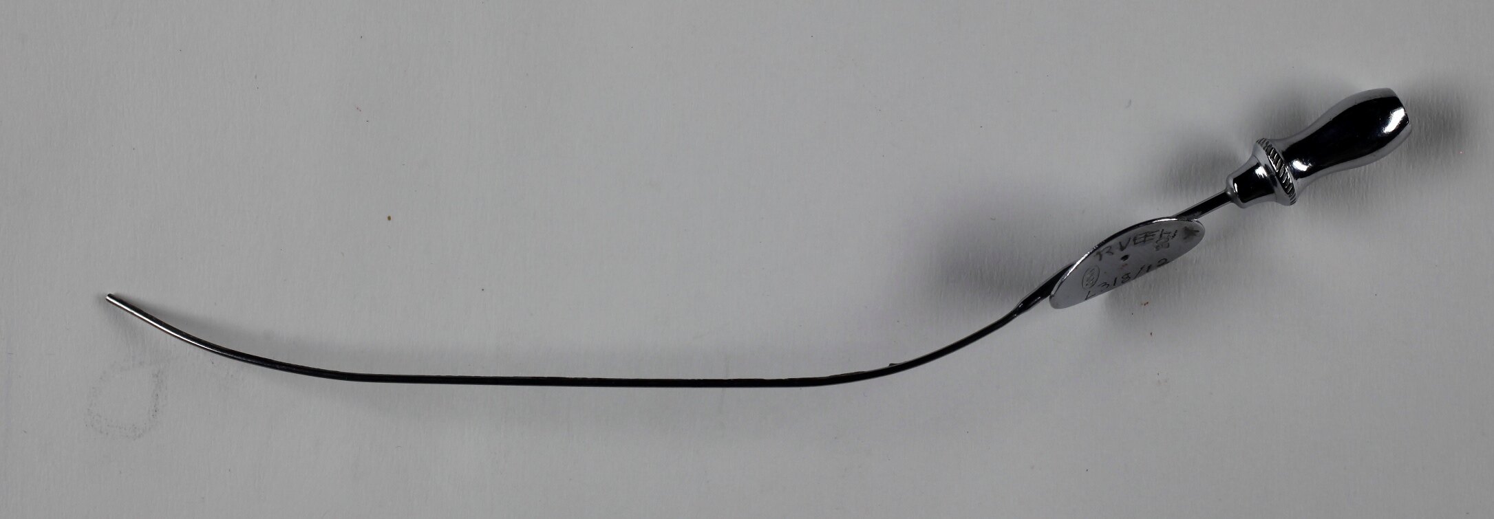 Hourglass-shaped metal top with a ole hole at the top. It has a thin curved metal tube attached with a very small hole at the end. At the top of the thin metal tube, there is a thin metal oval attached.