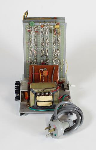 Three circuit boards and other electrical components fixed to a grey metal base, with grey plstic power cord and small white switch. , experimental precursor to implant.