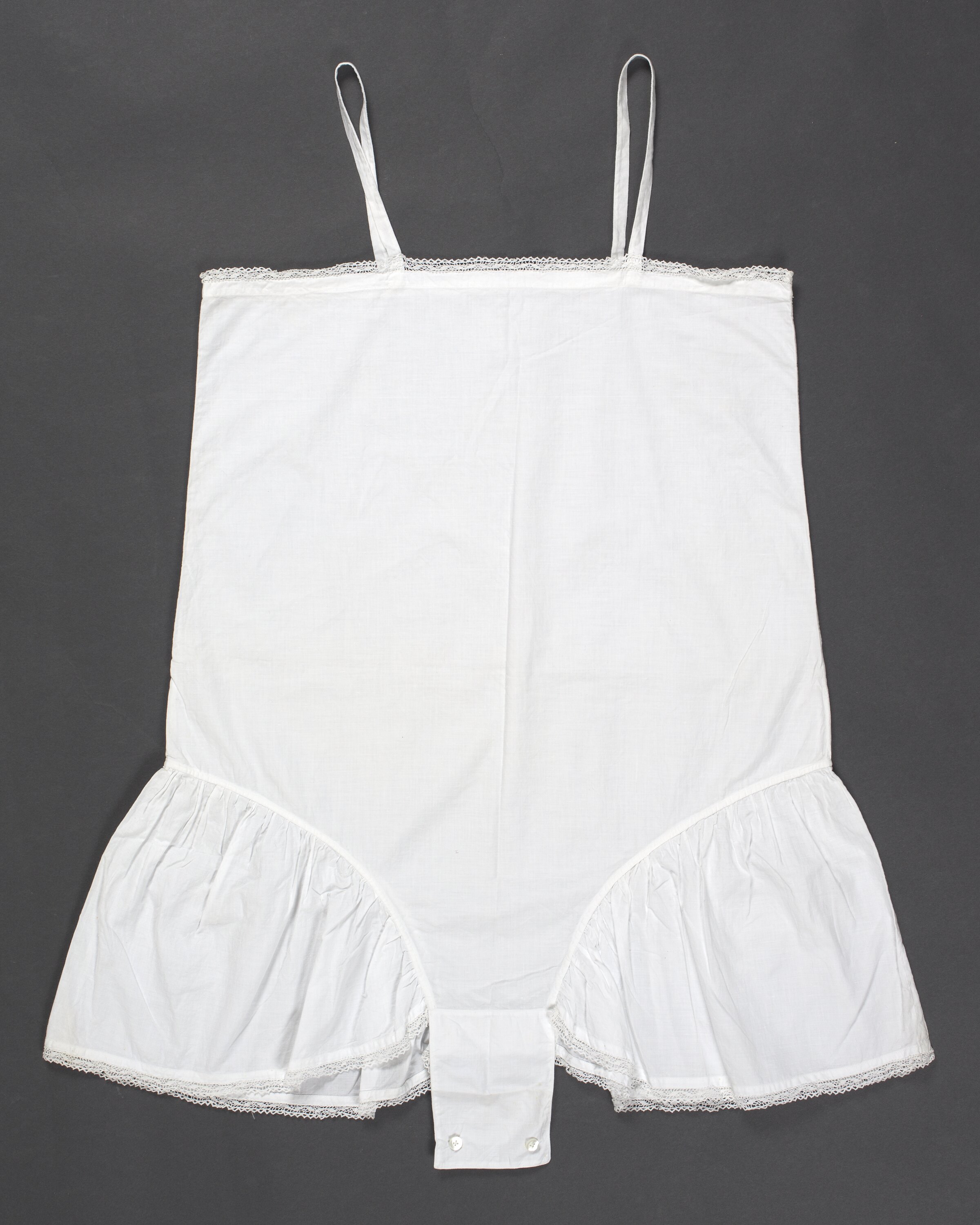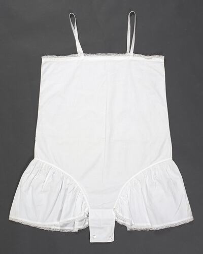 White bleached cotton 'teddy' with thin shoulder straps, fine lace trim along straight top of bodice, flaring out to slightly ruched bloomers with fine lace trim along each leg hole and central flap with 2 buttons to attach under the crotch. Small stitched insignia at centre top of bodice 'AA'.