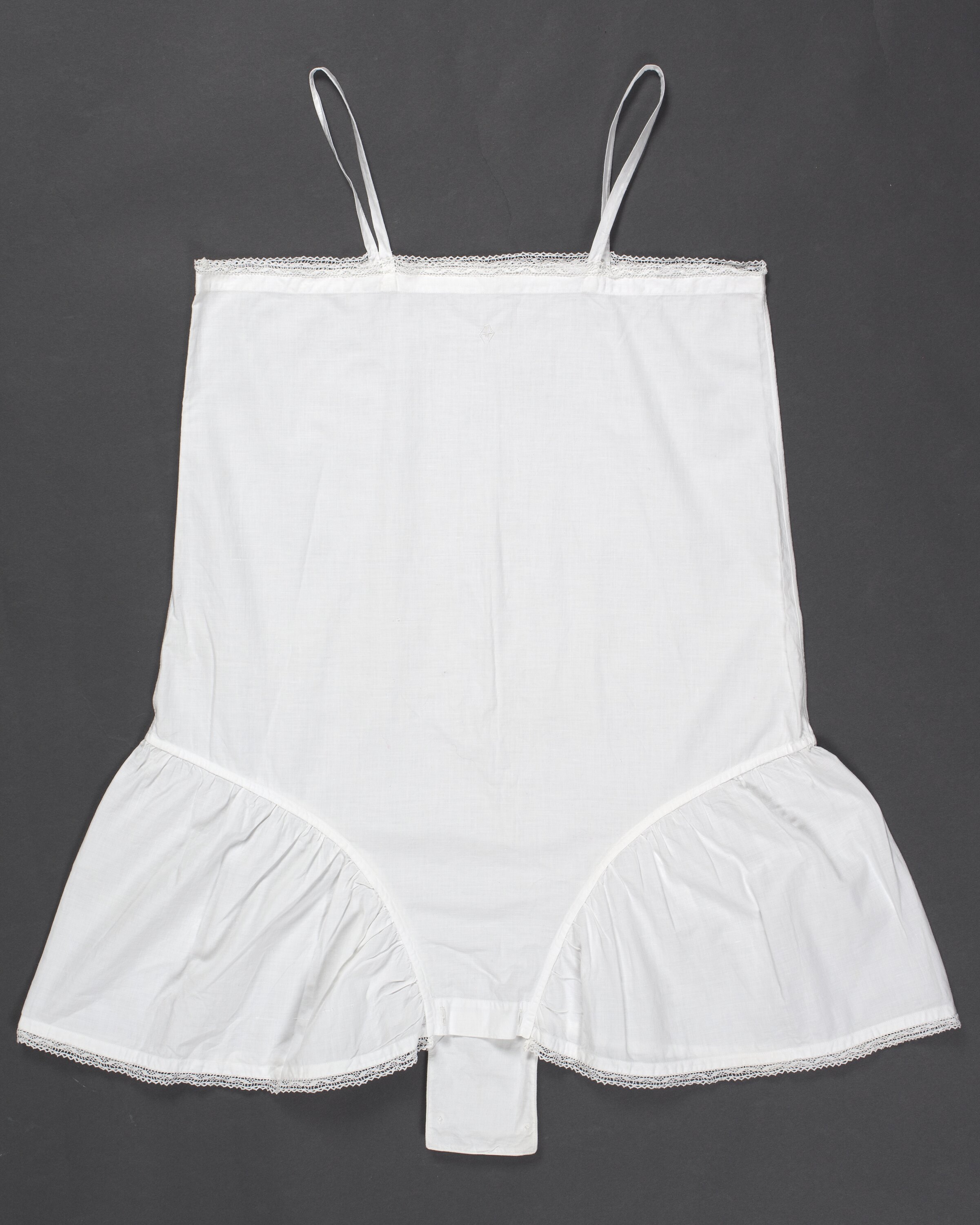 White bleached cotton 'teddy' with thin shoulder straps, fine lace trim along straight top of bodice, flaring out to slightly ruched bloomers with fine lace trim along each leg hole and central flap with 2 buttons to attach under the crotch. Small stitched insignia at centre top of bodice 'AA'.