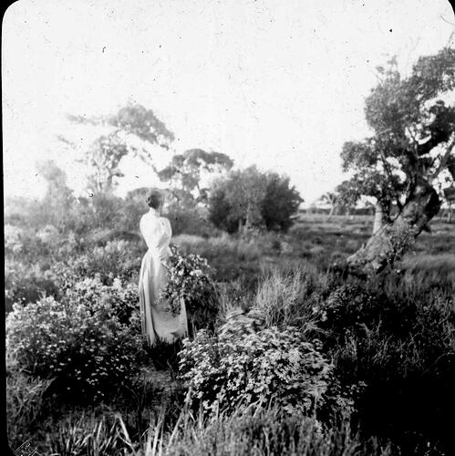 Black and white glass lantern slide of lady in a field picking wild flowers, suspected to be Elizabeth Campbell, wife of the photographer A.J. Campbell.