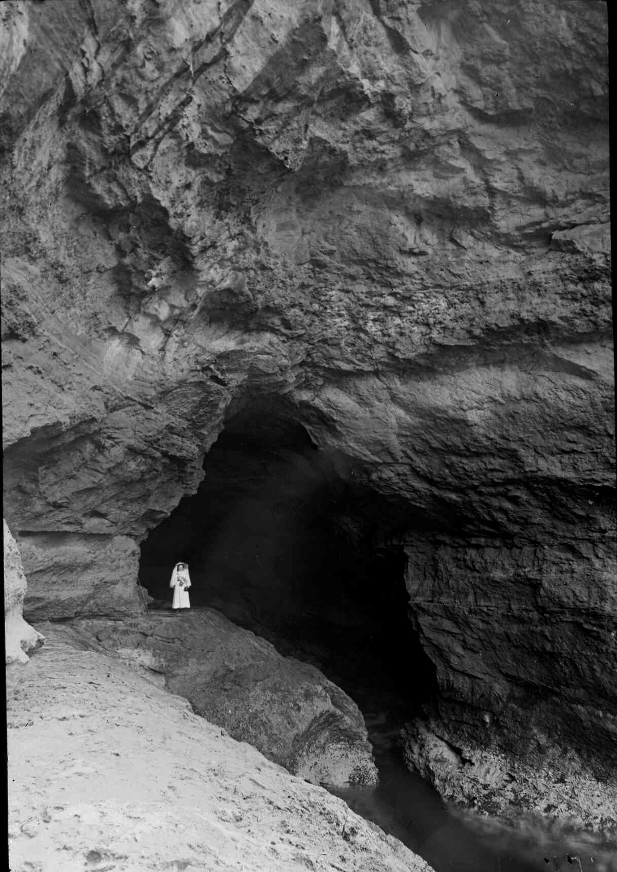 Black and white glass lantern slide of woman standing at entrance to a cave, photographed by A.J. Campbell.