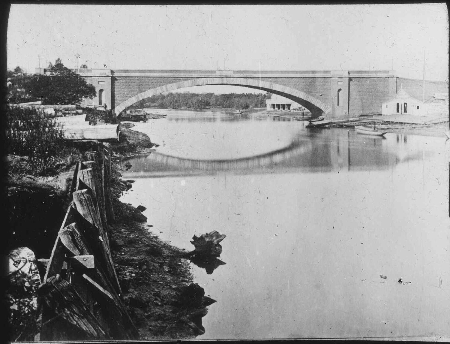 Black and white image of the original Princes Bridge crossing the Yarra River, Melbourne looking east with rowing club in the background, photographed by A.J. Campbell.