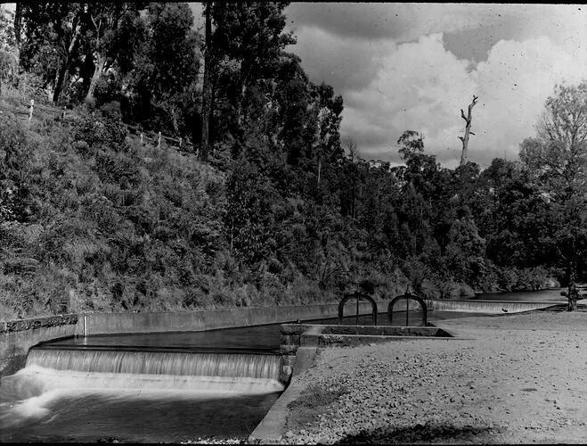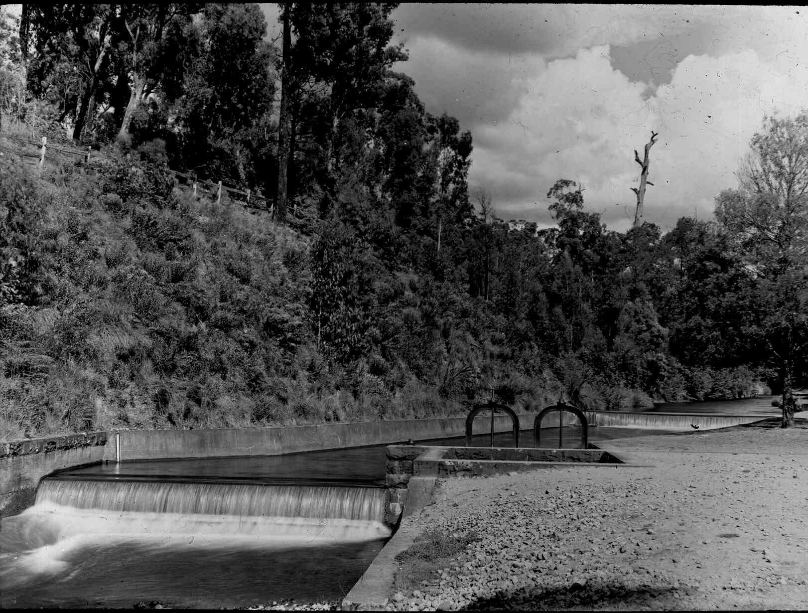 Black and white image of the catchment on Watts River prior to construction of the Maroondah Dam commenced in 1920, photographed by A.J. Campbell. The principal purpose of the dam and its reservoir is to supply potable water for greater metropolitan Melbourne.