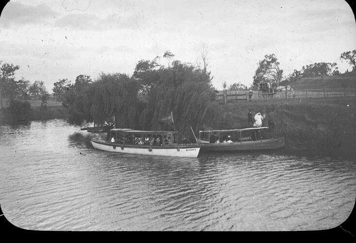 Black and white image of the bride, Catherine Campbell, daughter of naturalist and conservationist Archibald James Campbell, approaching the river boats before sailing down the Yarra River as part of the wedding celebrations. Catherine married German Emil Grotjan who had a difficult time in Australia during World War 1 due to his nationality. Photographer unknown.