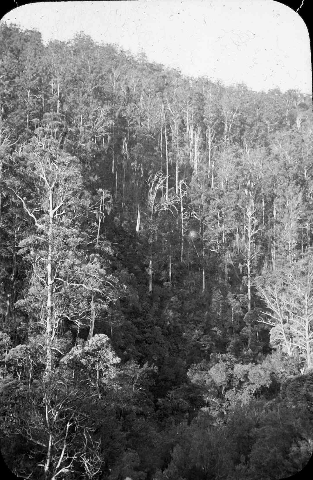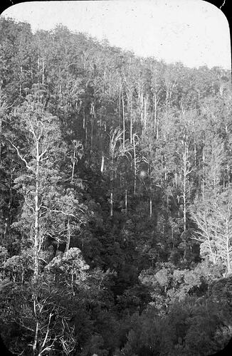 Black and white image of the side of a mountain in the Victorian highlands showing the dense growth of trees and undergrowth, photographed by A.J. Campbell.