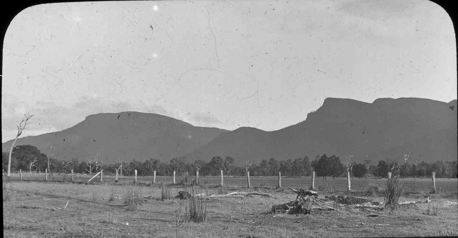 Black and white image of Mt William and Mt Redman in the Grampians taken from the plains, photographed by A.J. Campbell.