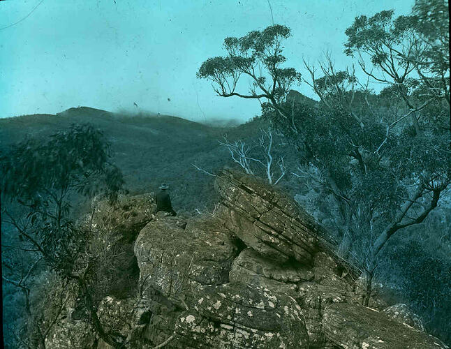 Hand coloured image of Mt Redman in the Grampians of Victoria, photographed by A.J. Campbell. The gentleman in the image has not been identified.