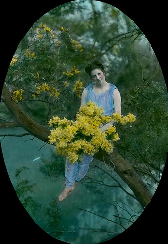 Colour image of unidentified lady sitting on a tree branch surrounded by golden wattle, photographed by A.J. Campbell.