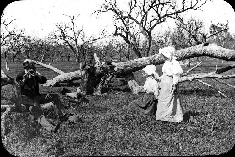 Black and white image of a man playing a flute to two young girls in a paddock containing trees suffering die-back, commonly found in the northern areas of Victoria. Photographed by A.J. Campbell, unfortunately the people in the image cannot be identified.
