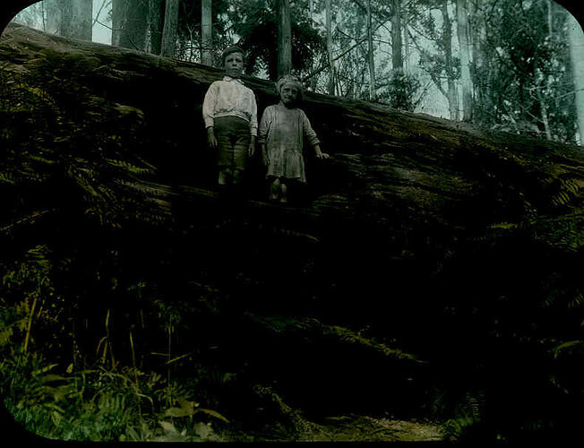 Colour image of a giant tree fallen in the forest of Sherbrooke in the Dandenongs of Victoria, photographed by A.J. Campbell. The two children have not been identified.