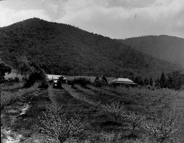 Black and white image of A.G. Campbell's orchard in Pomonal with the Grampians in the background, photographed by A.G. Campbell, son of A.J. Campbell.