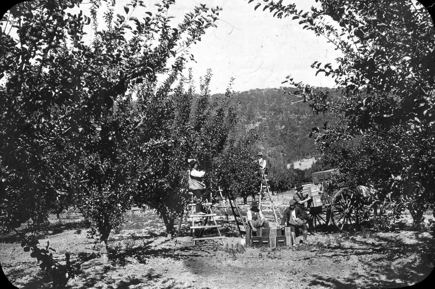 Black and white image of picking fruit in the orchard at Pomonal in Victoria where A.G. Campbell and his family lived from 1908 to 1912. Photographed by A.G. Campbell, son of A.J. Campbell.