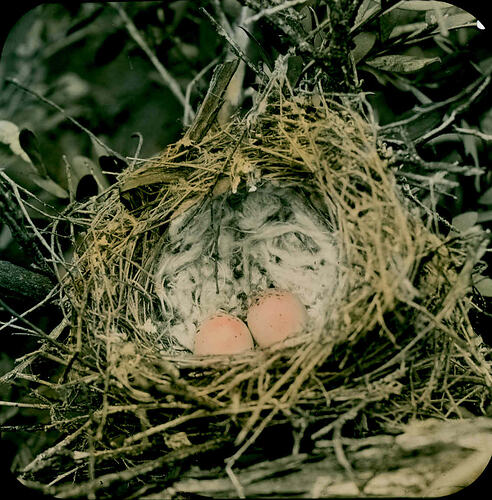 Colour image of the nest of a New Holland Honeyeater (noted at the time by A.J. Campbell as a yellow winged honeyeater) with eggs, photographed by A.G. Campbell, son of A.J. Campbell.