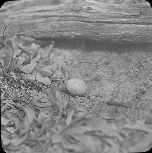 Black and white image of an egg of the White-throated Nightjar in nest photographed in Gruyere, Victoria by A.J. Campbell.