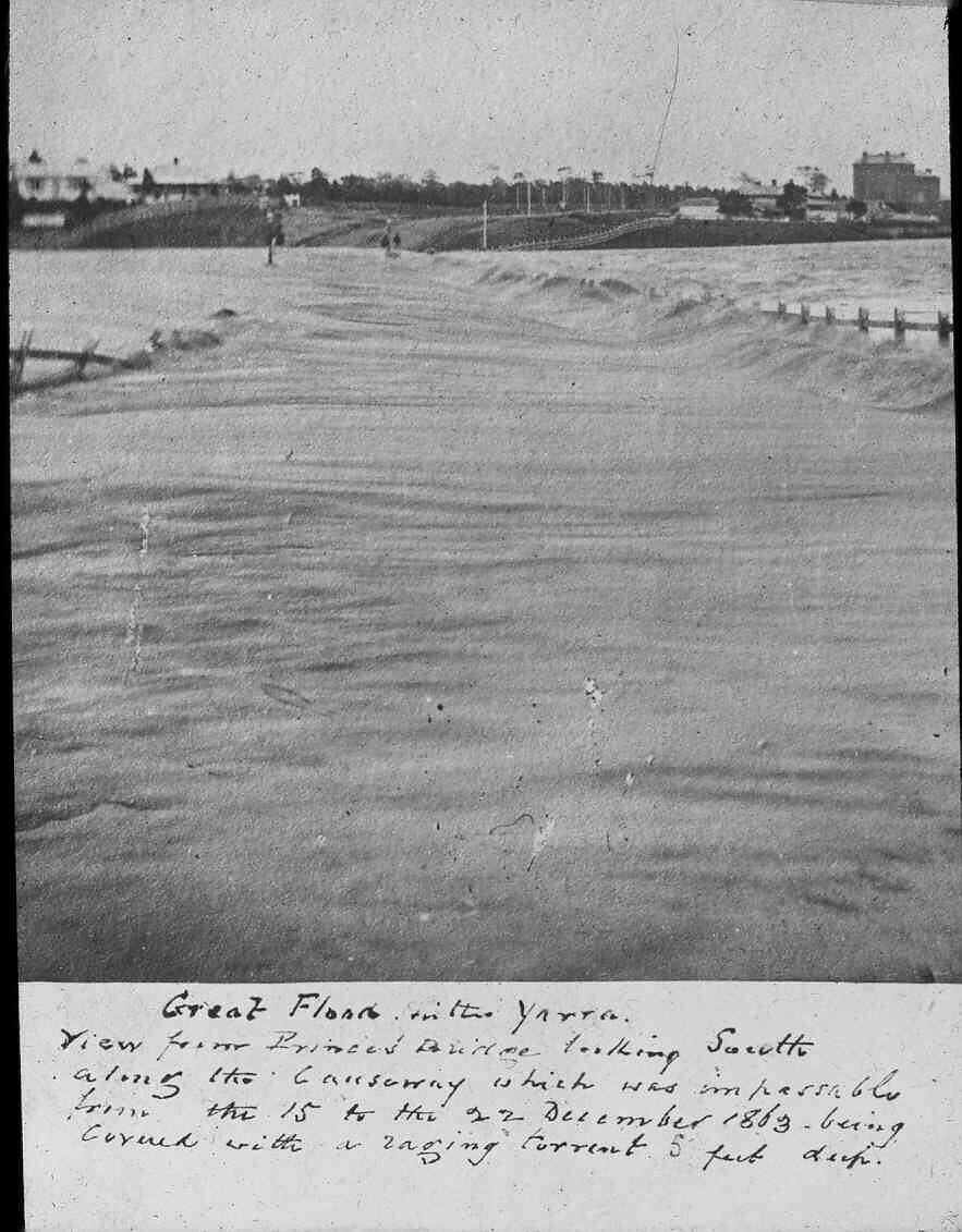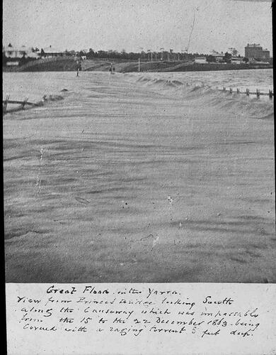Black and white image of the Great Flood in the Yarra River. View from Princes Bridge looking south along the causeway which was impassable from the 15 to 22 December 1863 due to being covered with a raging torrent five feet deep. Photographer unknown.