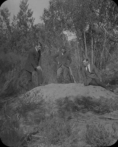 Black and white image of three unknown gentlemen viewing the mount of a mallee hen, now known as a Malleefowl, photographed by A.J. Campbell.