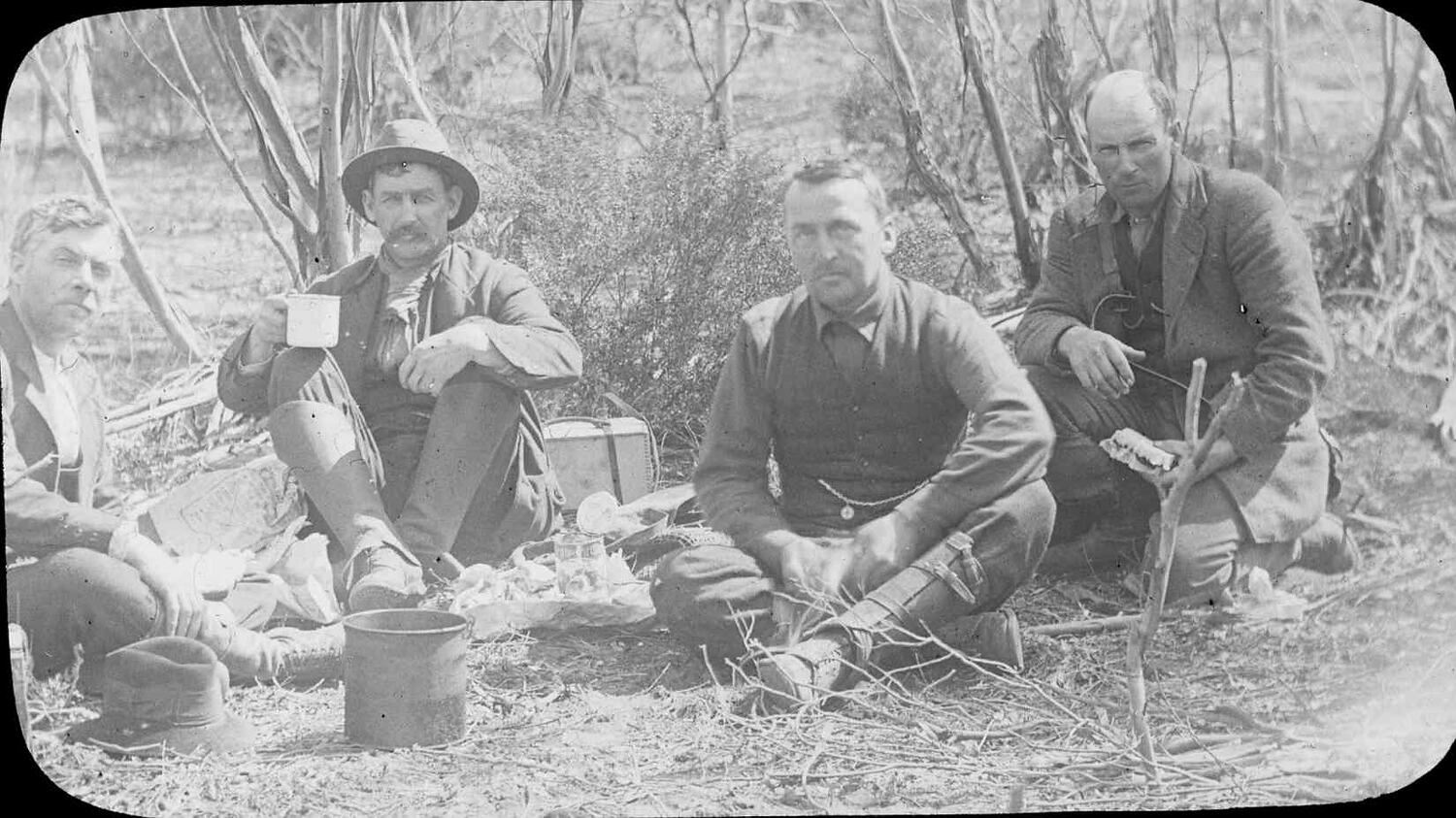 Black and white image of four gentlemen taking a lunch break, probably while on a field trip, photographed by A.J. Campbell. The gentlemen from left to right are Messrs F.E. Howe, J.A. Ross, H.A. Purnell and Archer.