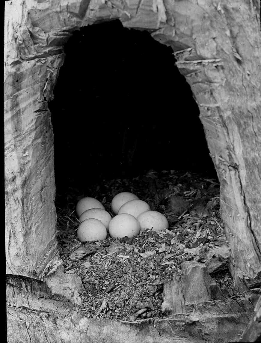 Black and white image of the nest of a Rosella with seven eggs, photographed by H.A. Purnell.