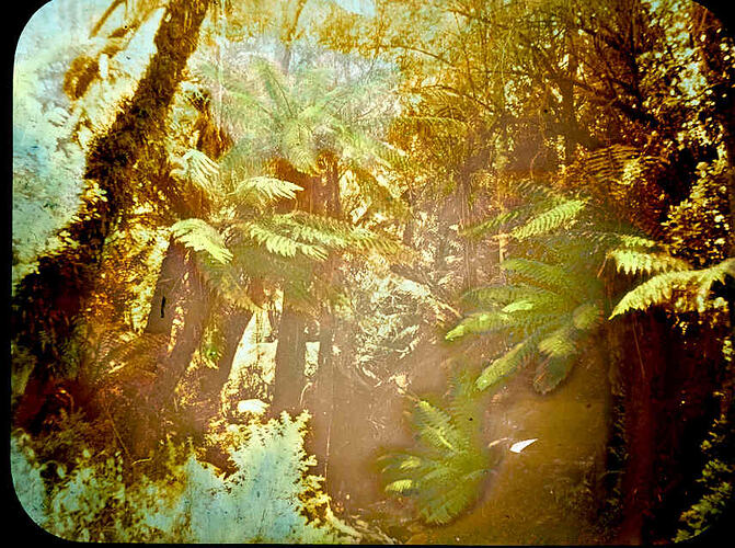 Coloured image of the tree ferns, Dicksonia antarctica, in Ferntree Gully photographed by A.G. Campbell, son of A.J. Campbell.