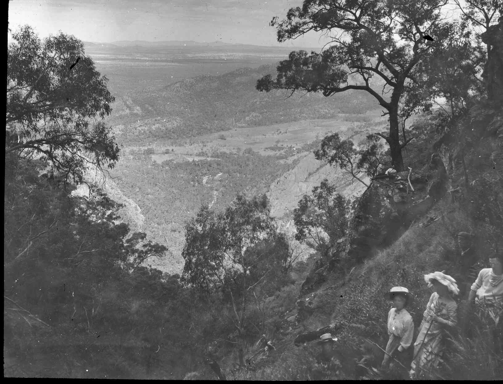 Black and white image of people exploring the western face of the Dandenongs around the Kilsyth/Montrose area, overlooking Mt Disappointment in the distance, photographed by A.J. Campbell.