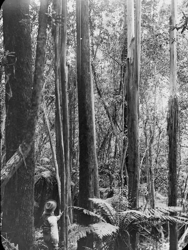 Black and white image of the straight tall timbers of Mast Gully in Upwey where replacement masts for ships in Melbourne harbour were acquired in the 1850s. It is thought the person in the image may be A.G. Campbell, son of A.J. Campbell.