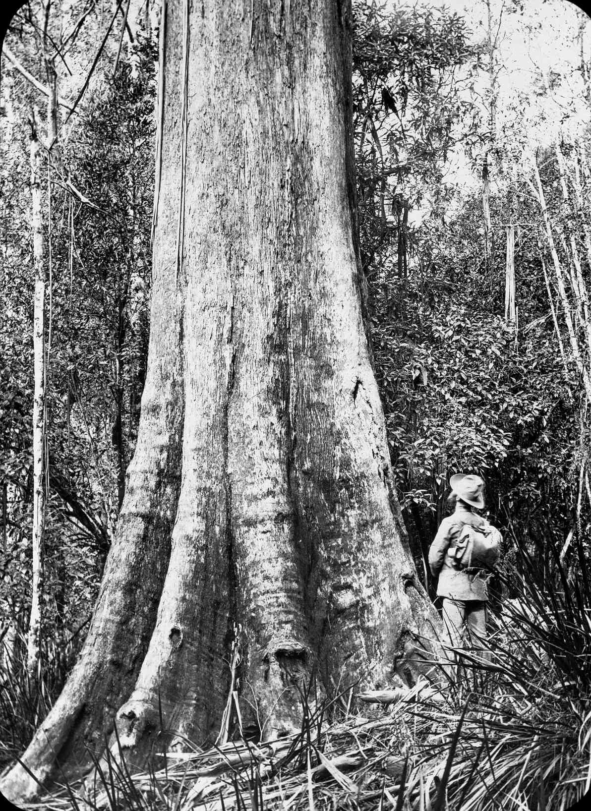 Black and white image of a large tree which may have been found in the Dandenongs of Victoria where the photographer A.J. Campbell spent much of his time. The gentleman has not been identified.