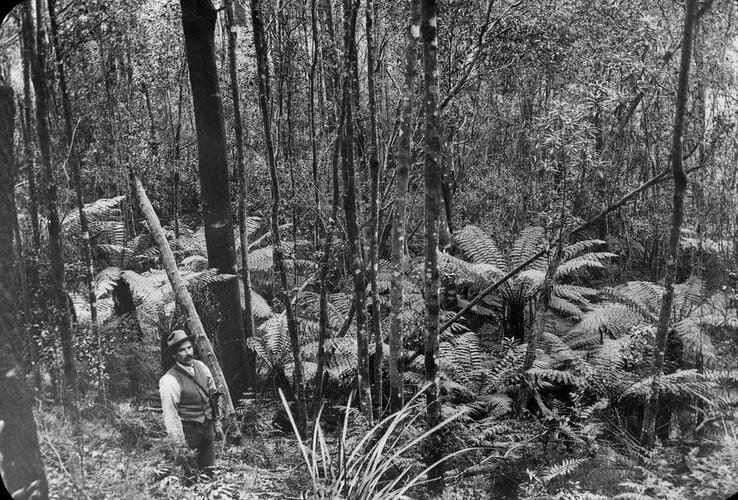 Black and white image of the straight tall timbers of Mast Gully in Upwey where replacement masts for ships in Melbourne harbour were acquired in the 1850s.