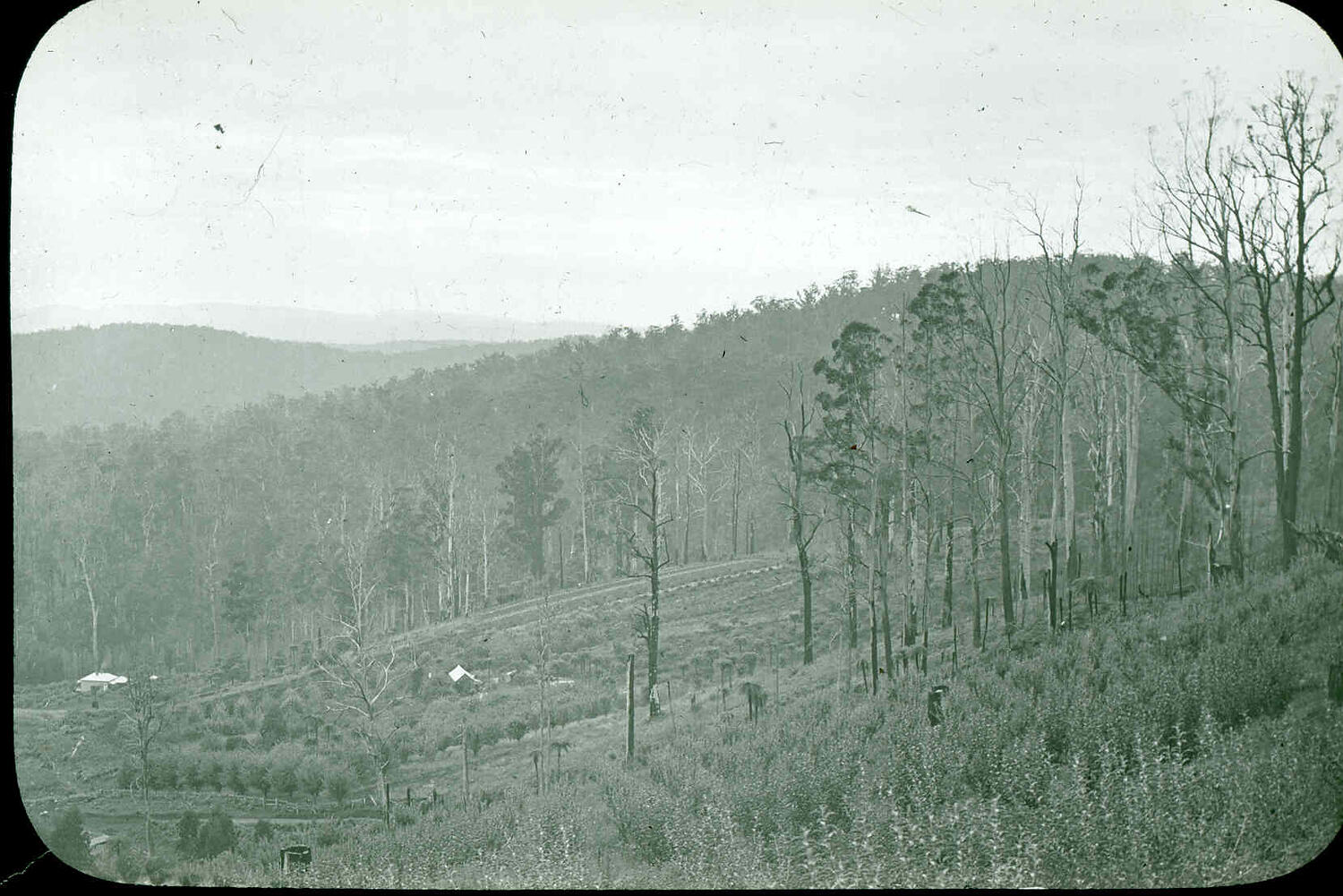 Black and white image of early settlement in Sassafras Valley of the Dandenongs in Victoria, photographed by A.J. Campbell.