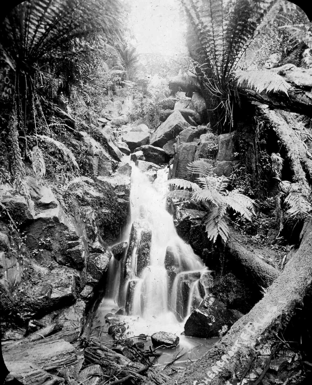 Black and white image of Sherbrooke Falls in the Dandenongs, photographed by A.G. Campbell, son of A.J. Campbell.