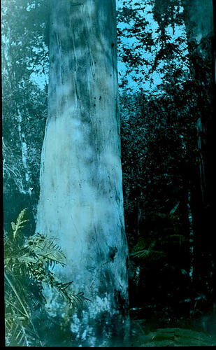 Colour image of a grey gum, sometimes referred to as a candlebark tree, in Ferntree Gully, Victoria, photographed by A.G. Campbell, son of A.J. Campbell.