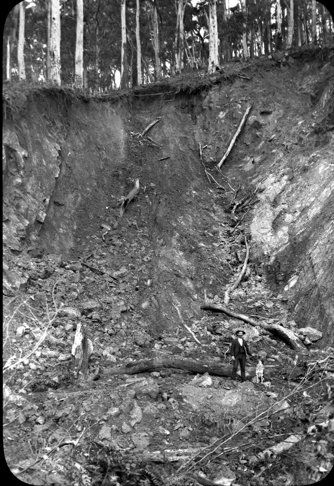 Black and white lantern slide that may have been taken by A.J. Campbell of the huge landslip that occurred in 1891 in what is now known as the Dandenong Ranges National Park. The gentleman in the image has not been identified.