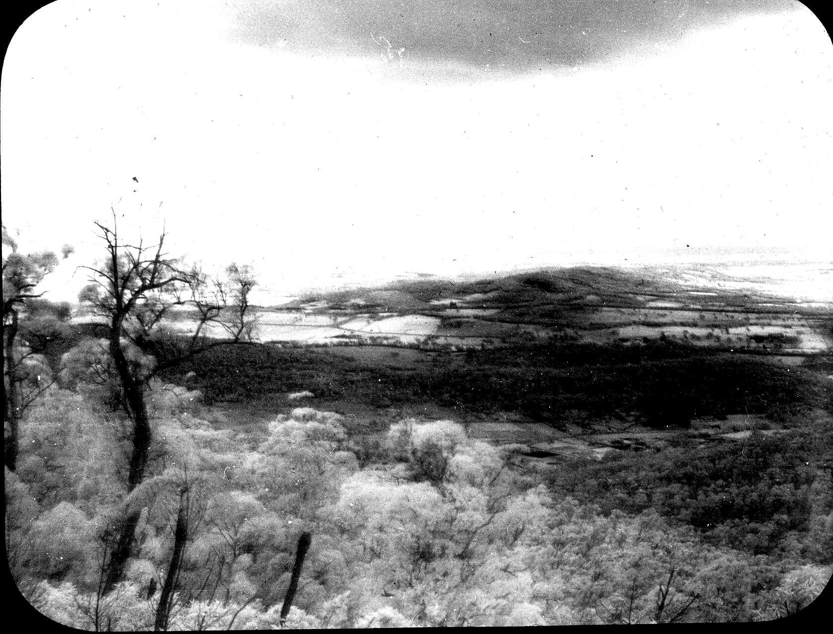 Black and white image of the Dandenongs taken from the lookout in Ferntree Gully.