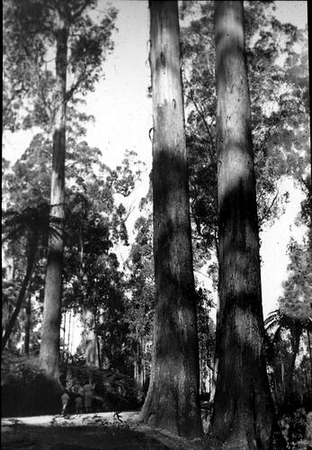 Black and white image of tall Eucalyptus regnans (mountain ash) near Olinda Falls, photographed by A.G. Campbell, son of A.J. Campbell.