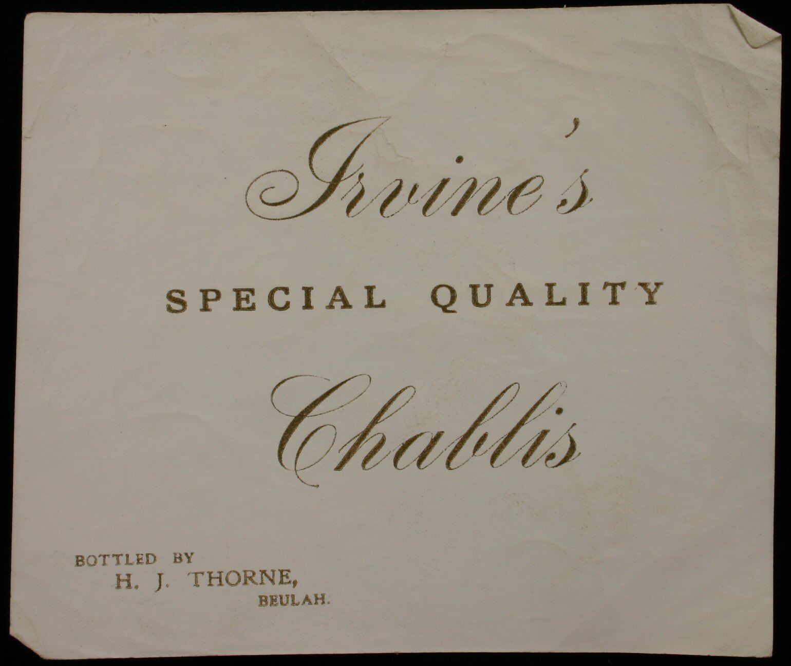 Wine label is printed in gold ink and reads: ""Irvine's Special Quality Chablis. Bottles by H.J. Thorne, Beulah".