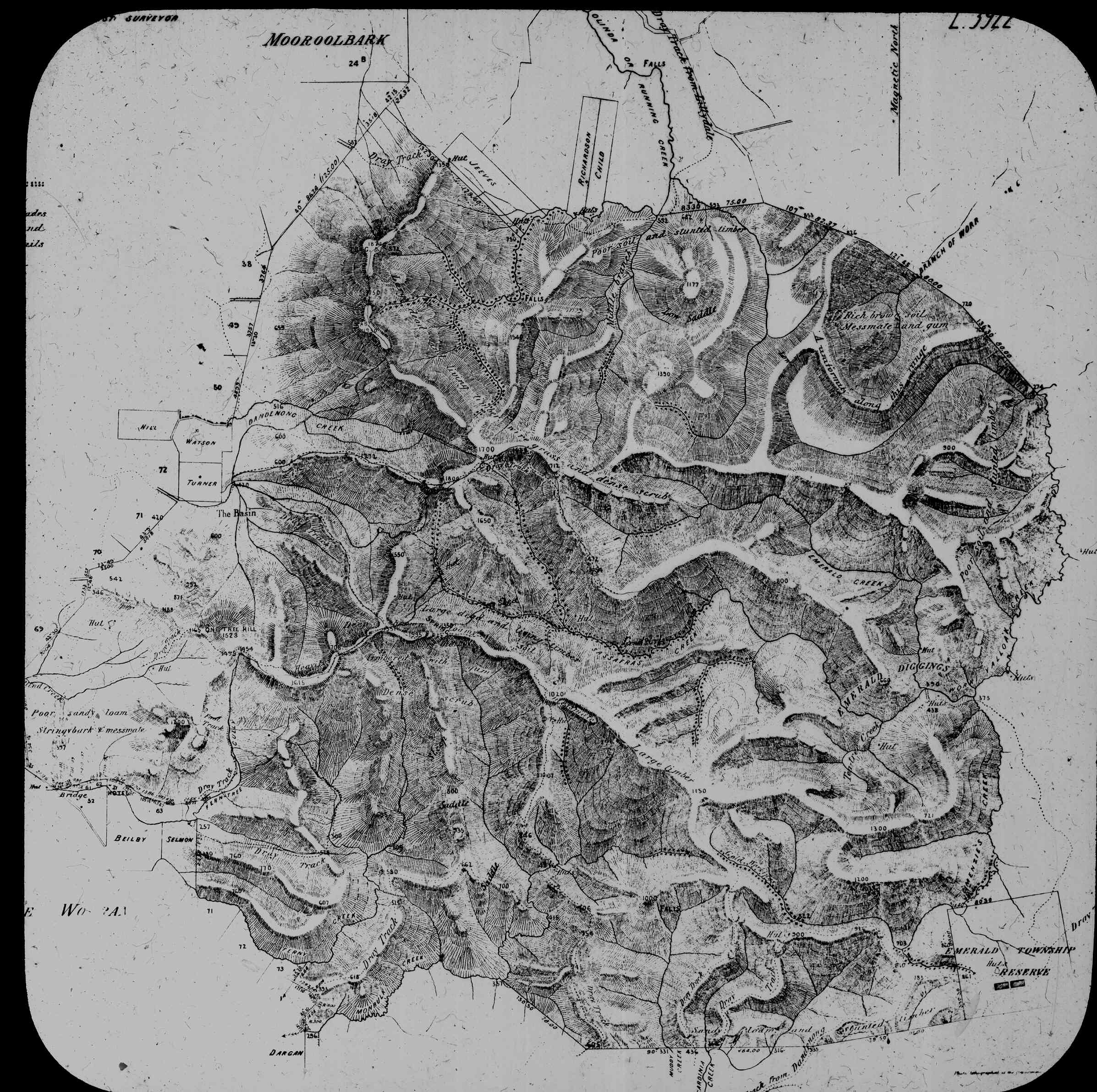 Black and white image of a relief map showing the Kilsyth area in the Dandenongs, photographed by A.J. Campbell, possibly used to illustrate one of his many lectures he would give to interested groups about his walking treks through the Dandenongs.