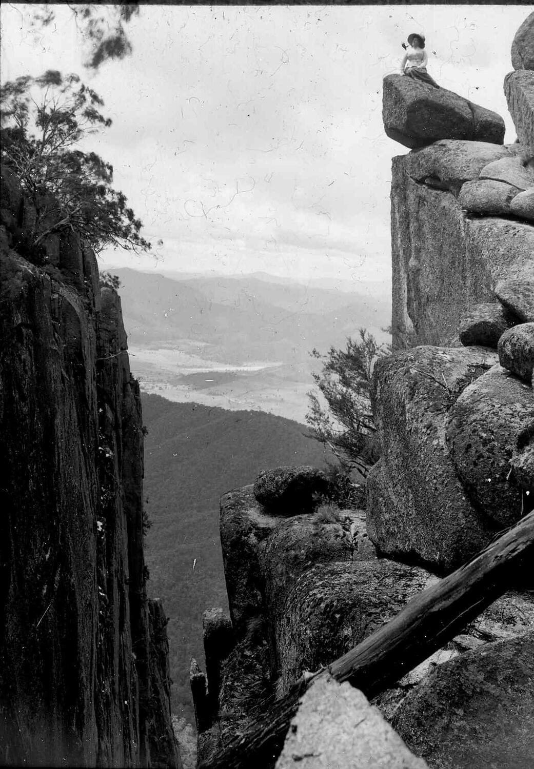 Black and white image of a very daring lady sitting on top of Pulpit Rock in the Grampians, photographed by A.J. Campbell.